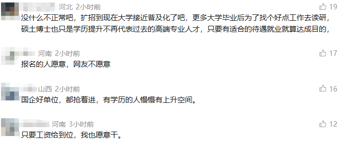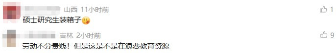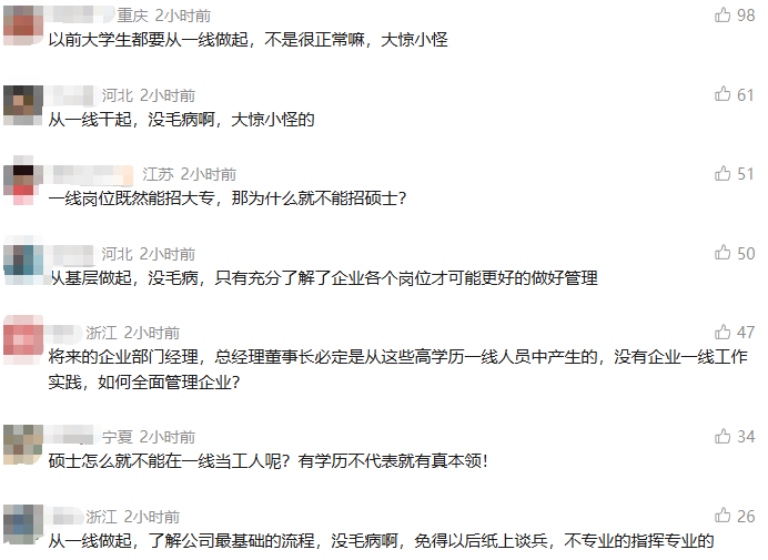 有网友直言:“从一线干起,没毛病啊,有学历不代表就有真本领”,也有人质疑:“劳动不分贵贱,但硕士研究生装箱子,这算不算浪费教育资源?”有人说,“一直扩招,大学接近普及化了,待遇合适,就业就算达成了”,也有人调侃:“报名的人愿意,网友不愿意”。