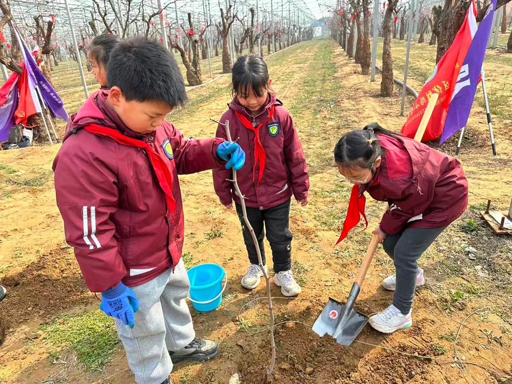 2026年3月10日,在党团老师们的带领下,优胜少先队员们来到郊外,开展植树活动。队员们以小组为单位投入劳作,跟着老师们一起,从挥锹挖坑、扶正树苗,到填土夯实、提桶浇水,师生默契配合,每道工序都凝聚着对绿色的守护。队员们还精心设计了个性化的树牌,将环保承诺与成长心愿镌刻在枝头,并融入劳动的每一个细节。