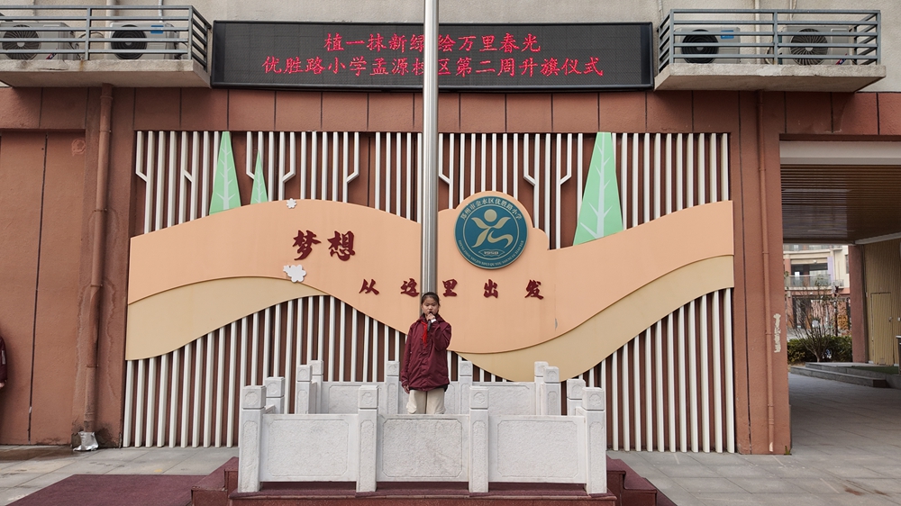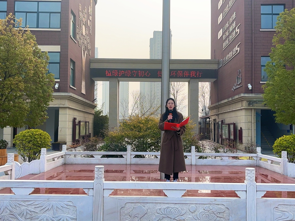在雄壮的国歌声中,五星红旗冉冉升起,升旗仪式正式拉开帷幕。队员代表带来了《植树造林同践行 共绘绿色新画卷》的主题演讲。他立足新时代少先队员使命,号召全体同学从节约一张纸、种下一棵苗的小事做起,以实际行动践行环保初心。