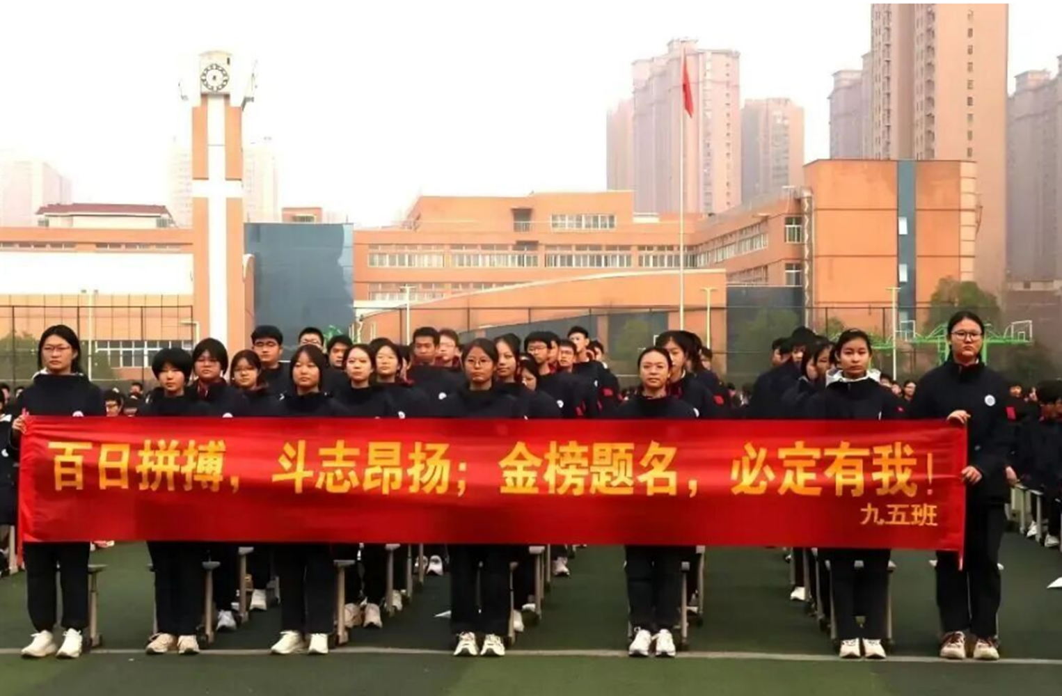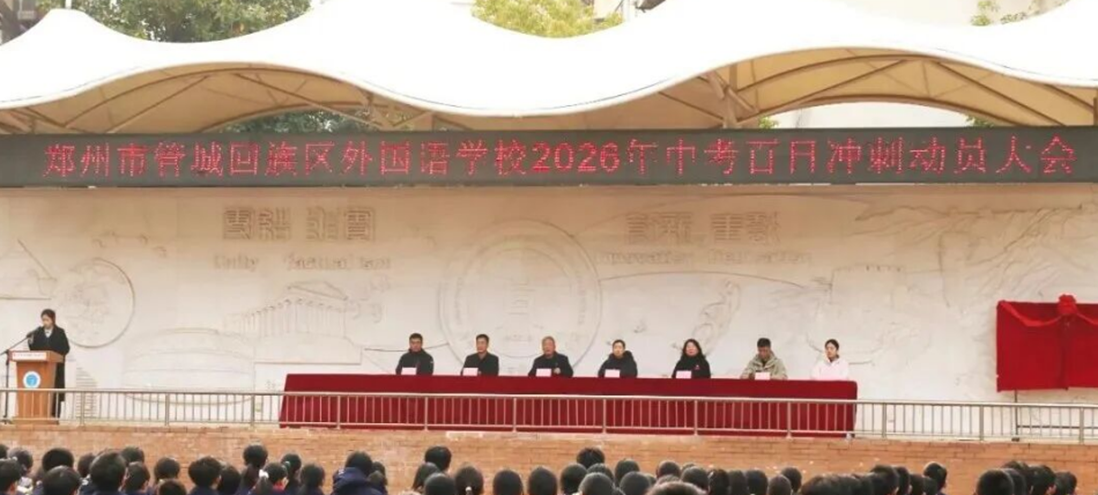 春回大地,万物竞发;战鼓催征,激情澎湃。面对新学期中招备考时间短、学习任务重,开局即决战,起步即冲刺的形势,为给九年级学子们加油鼓劲、指明方向、凝聚力量、坚定信念,激励他们在最后一百天里以昂扬的斗志、科学的方法、坚韧的毅力迎接人生中的重要挑战,3月12日下午,郑州市管城回族区外国语学校2026年中考百日冲刺动员大会在操场庄重举行。学校党委书记司德平,党委副书记、校长庞俊娜,正校级干部陈刘永,副校长石会娟,副校长刘超,副校长马晓红,优秀毕业生郝淑文与九年级全体师生齐聚操场,以坚定信念与昂扬姿态,吹响了百日攻坚的冲锋号角。