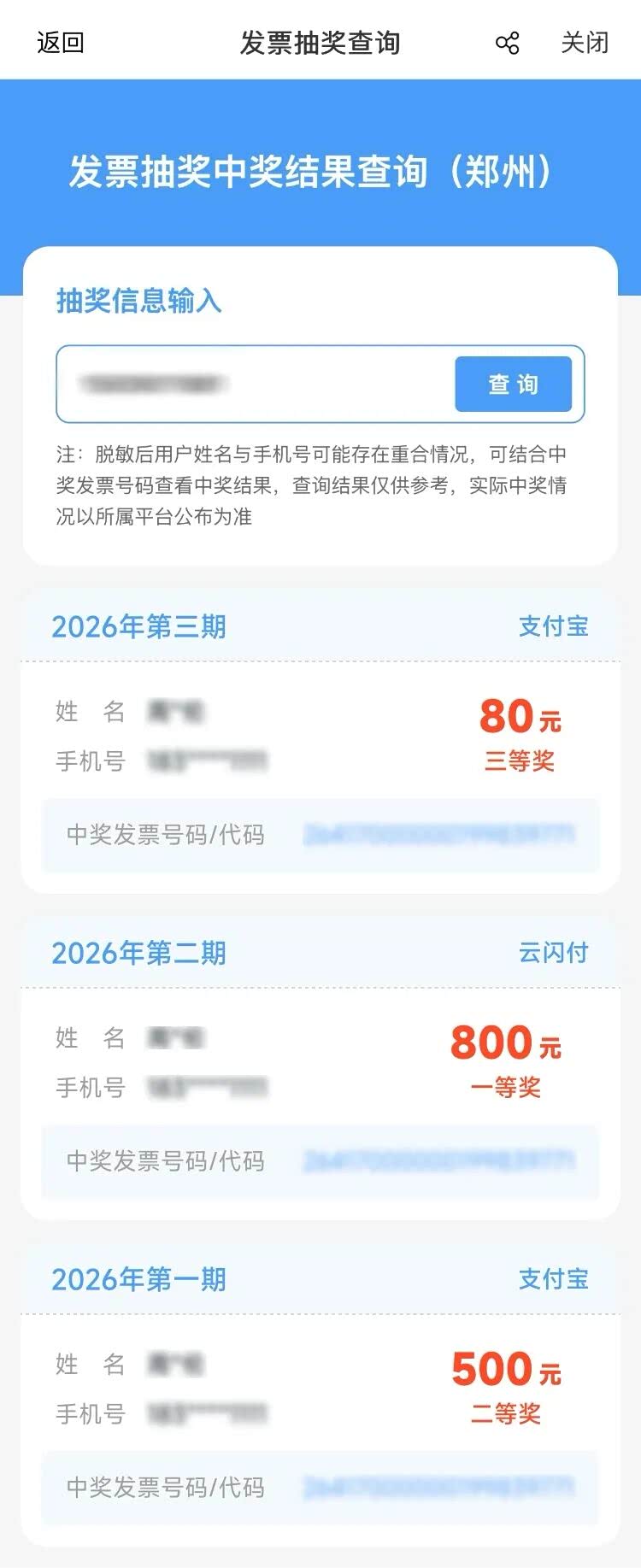 脱敏后用户姓名与手机号可能存在重合情况,大家可结合中奖发票号码查看中奖结果。查询结果仅供参考,实际中奖情况以官方平台公布为准。开奖当日数据可能存在延迟同步,如未查询到当期中奖记录,请稍候再试。