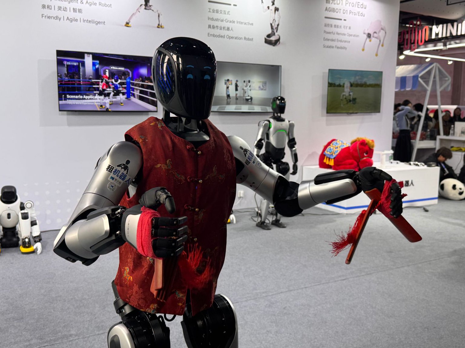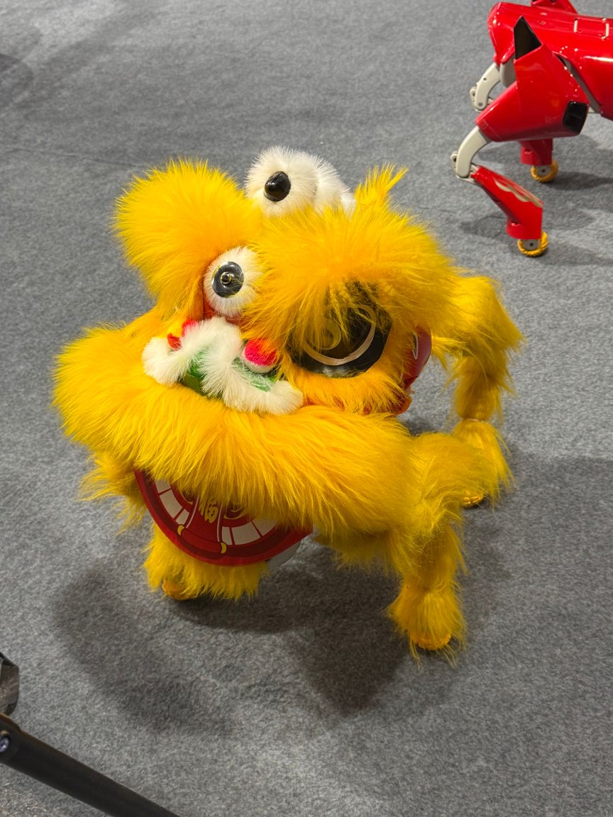 酷拓D1四足机器人以多元造型惊艳亮相,装扮成赤焰马、熊猫狗、狮子狗三种形态,在动态舞台区完成精彩表演,充分展现四足机器人的灵活运动能力与场景适配性,为文娱商演、安防巡检等场景提供全新解决方案。