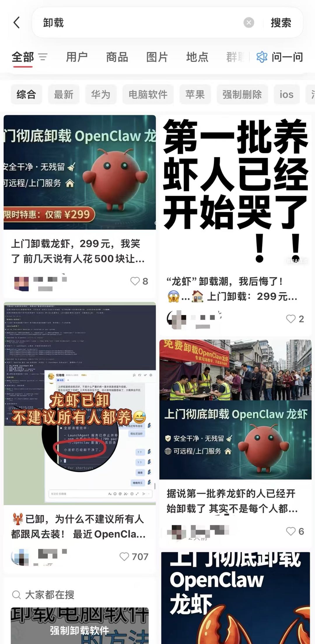 如今,她开始考虑卸载“龙虾”,她发现,小红书上关于“如何彻底卸载OpenClaw”的求助帖比比皆是,而搜索“卸载”,就会出现“小龙虾卸载299元”的广告。