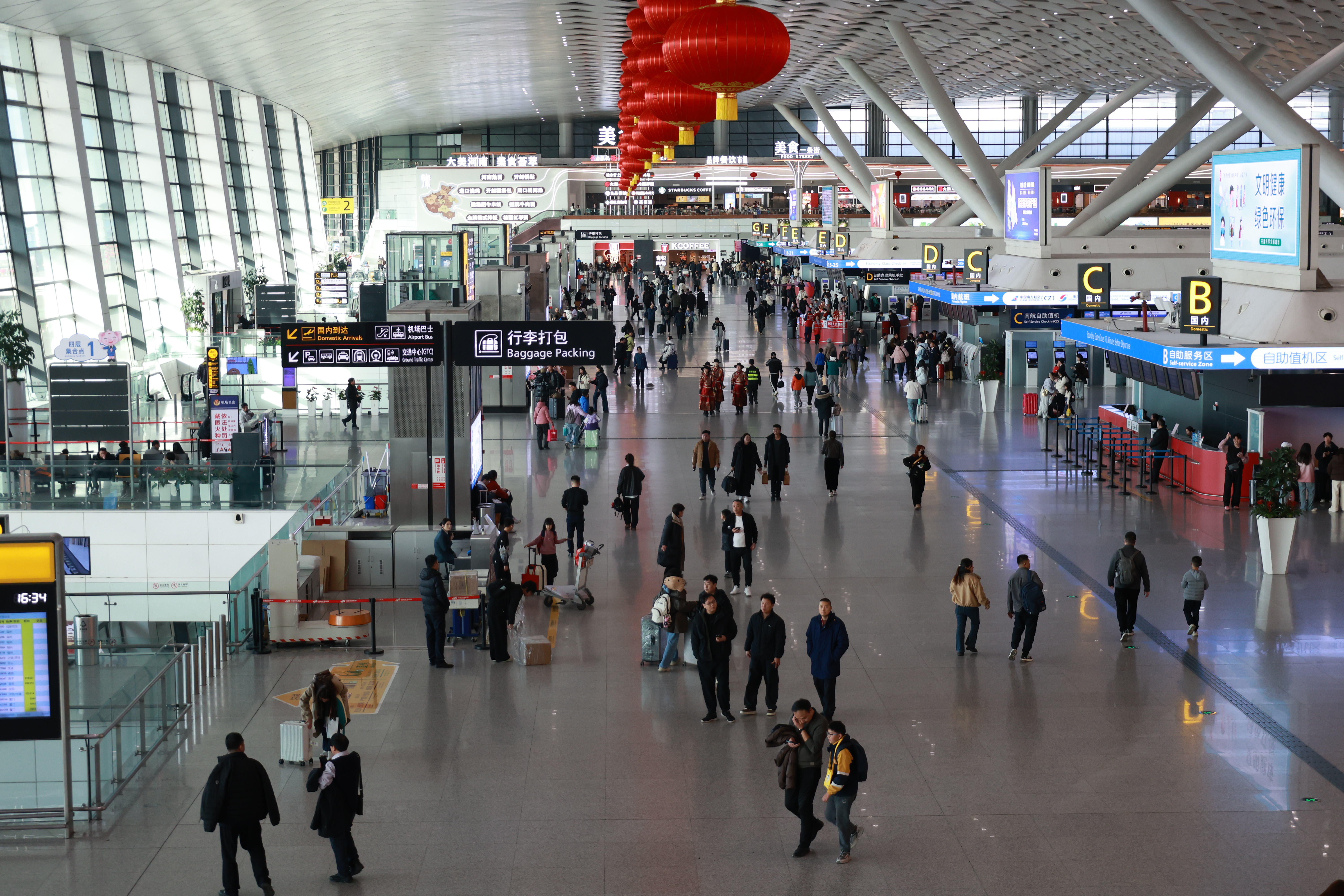 暖心的服务让归途顺畅,扑面而来的年味则让航站楼“热”了起来。自2月5日“同畅郑好 乐享空港”迎新春文化活动启动,T2航站楼内天天有惊喜:联合河南省非物质文化遗产保护和智慧化中心共同主办的“百马迎春 奔腾向前”非遗剪纸艺术展将持续到3月31日,百幅“马”主题作品精巧陈列,旅客可亲手体验。河南省书法家协会的书法名家现场挥毫写春联、送“福”字。网红“雪王”与机场吉祥物联手巡游,所到之处欢声笑语。00后非遗传承人现场制作“马上有福”生肖糖画,引得孩子们阵阵欢呼。新春游园会的投壶游戏与安全科普相结合,加上元宵节品汤圆、猜灯谜、做花灯等活动,让旅客沉浸式感受美好节日出行体验。