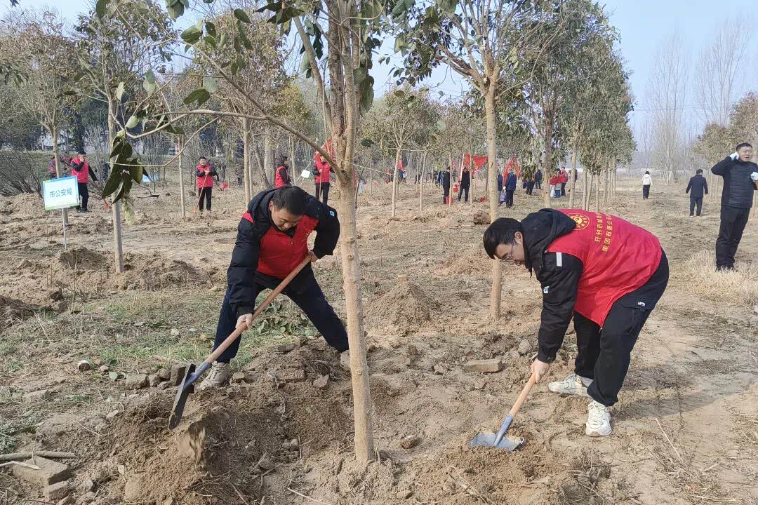 在全市2026年全民义务植树活动中,集团公司职工经过近两小时劳作,既定植树任务圆满完成,新栽苗木在春风中挺立,为黄河大堤增添绿色印记。