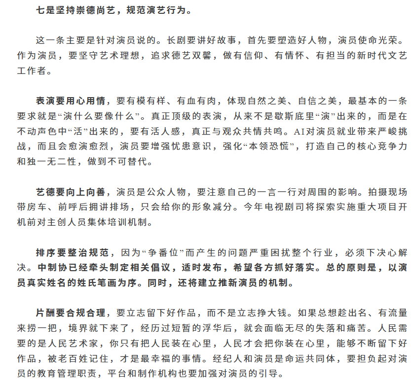 他在发言中提到,坚持崇德尚艺,规范演艺行为。排序要整治规范,因为“争番位”而产生的问题严重困扰整个行业,必须下决心解决。中制协已经牵头制定相关倡议,适时发布,希望各方抓好落实。总的原则是,以演员真实姓名的姓氏笔画为序。同时,还将建立推新演员的机制。