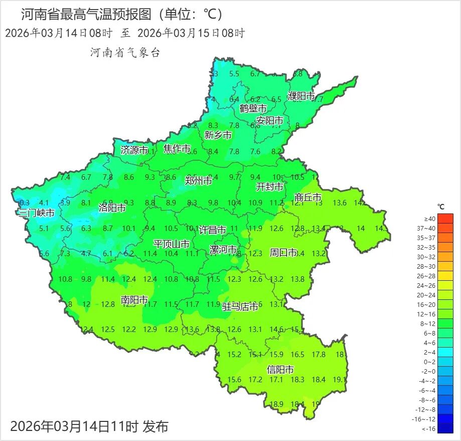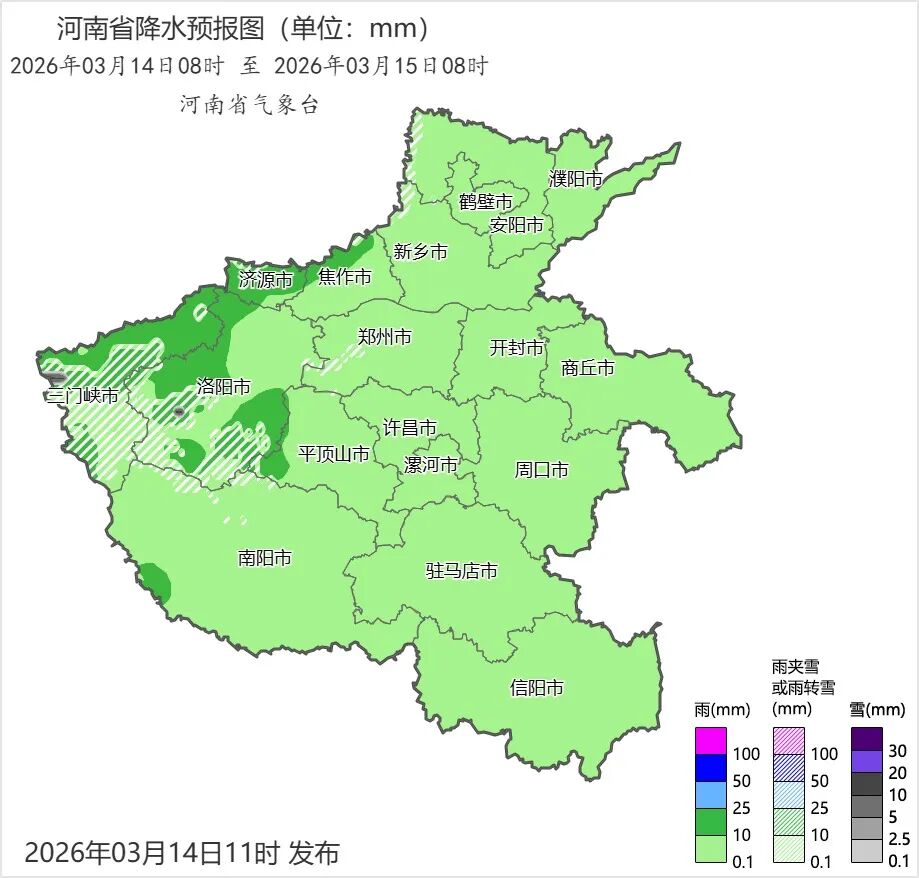 13日08时至14日08时,西部、西北部出现小雨。全省平均降水量0.4毫米,降水量最大为灵宝7.1毫米。