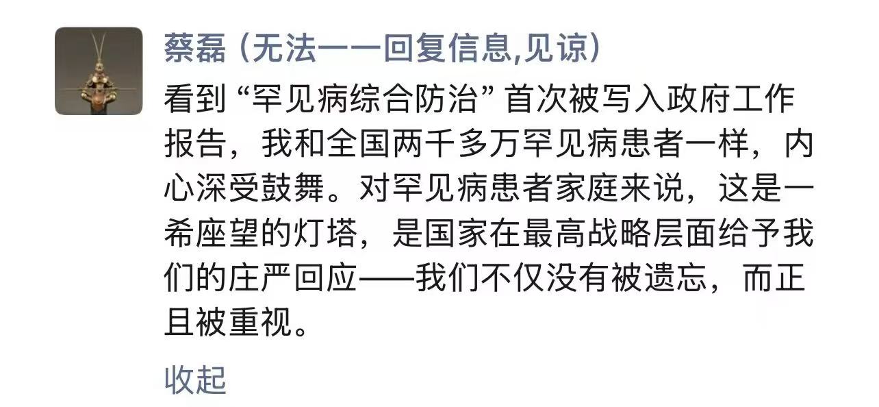 3月14日,渐冻症抗争者、京东集团原副总裁蔡磊公开回应“罕见病综合防治”首次被写入政府工作报告,他说,“我和全国两千多万罕见病患者一样,内心深受鼓舞。对罕见病患者家庭来说,这是一座希望的灯塔,是国家在最高战略层面给予我们的庄严回应——我们不仅没有被遗忘,而且正在被重视。”