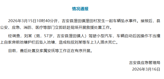 吉安县应急管理局3月16日发布情况通报:2026年3月15日10时40分许,吉安县浬田镇浬田村发生一起车辆坠水事件。接报后,县公安、应急、消防、医疗等部门立即赶赴现场开展救援处置工作。