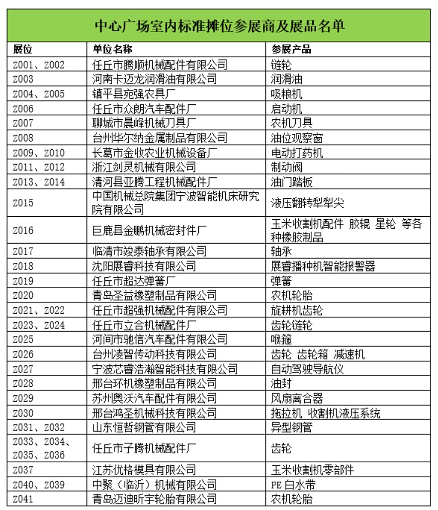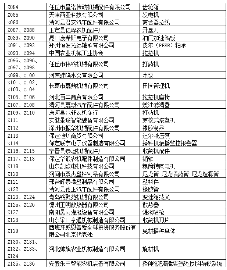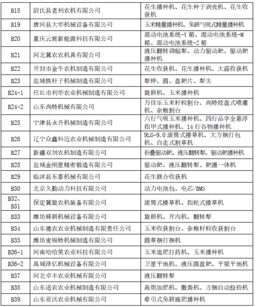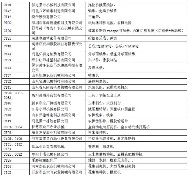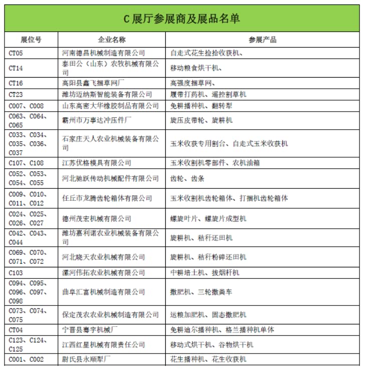 C展厅包含室内特装区和净地展区,特装设施及产品限高5米,设置特装展位49个,净地展位133个,展览面积8200平,展示企业91家,展示企业包括河北农哈哈、河南德昌、石家庄天人、锐牛股份、新乡立广、南通卓越、河北黑一等整机及零部件企业,展示产品包括:自走式花生捡拾收获机、移动粮食烘干机、玉米收获专用割台、传动胶带、弹簧弹齿、喷灌机、播种机、割草机等产品。