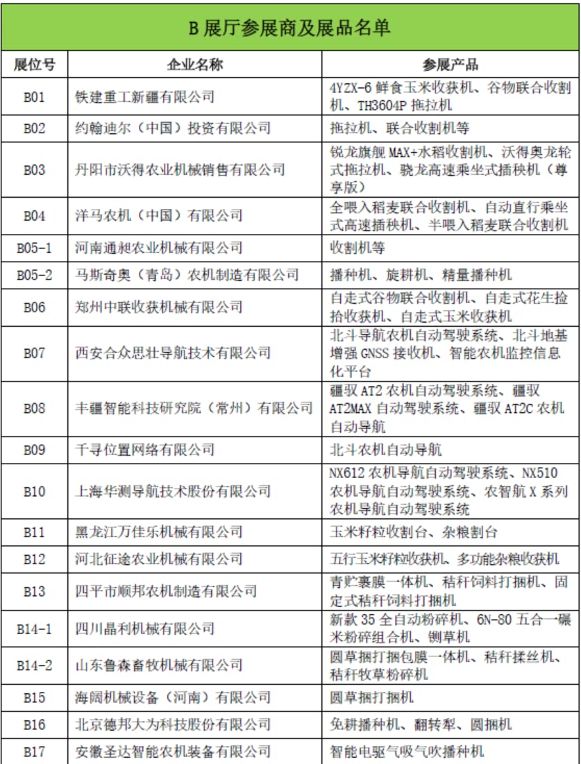 B展厅为室内特装展厅,展览面积10000平,展示企业包括沃得农机、约翰迪尔、铁建重工、德邦大为、四平顺邦、合众思壮等内外资骨干整机及零部件企业,展示产品包括:轮式拖拉机、谷物收获机、玉米收获机、插秧机、打捆机、精量播种机、青饲料收获机、花生收获机、北斗导航自动驾驶系统、农用轮胎等。
