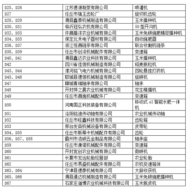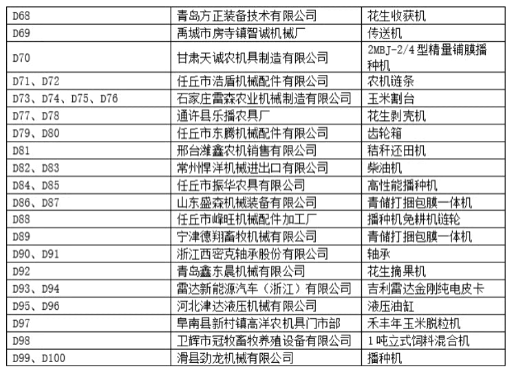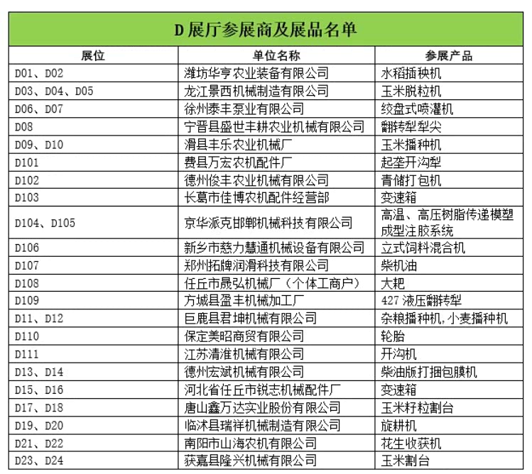 D展馆为室内净地展位,设置摊位111个,展示企业71家,展示产品主要以插秧机、脱粒机、喷灌机、播种机、开沟犁、打包机、变速箱、耙、柴油机等各类农机零部件为主。