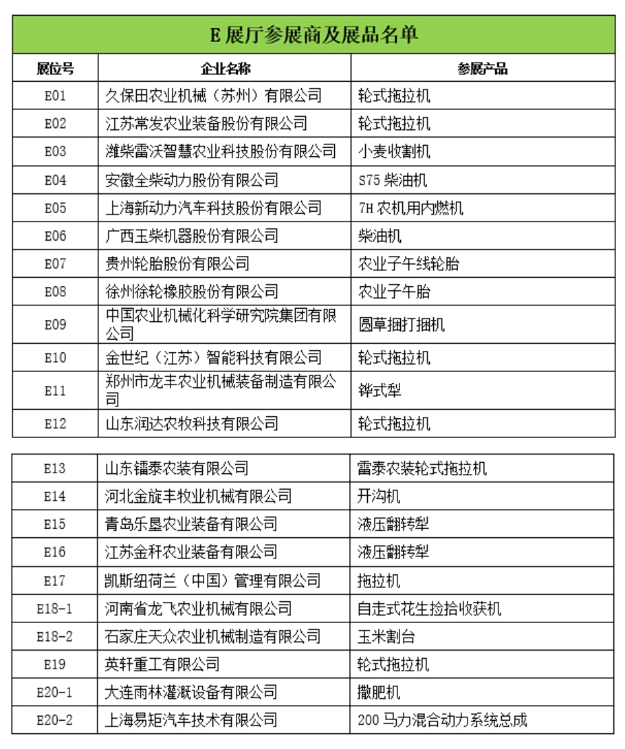 E展厅为室内特装展厅,展示企业包括久保田、潍柴雷沃、中国农机院、江苏常发、英轩重工、安徽全柴、上海新动力、广西玉柴、贵轮、徐轮、郑州龙丰等内外资骨干整机及零部件企业,展示产品包括:轮式拖拉机、谷物收获机、玉米收获机、插秧机、柴油机、轮胎、液压翻转犁、打捆机等。