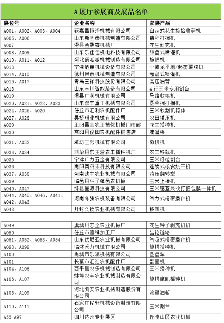 其中,A展馆全部为室内净地展位,展位规格为3米*6米,设置展位111个,参展商包括34家农机企业和四川达州专业展区,展示产品包括:液压翻转犁、玉米播种机、移栽机、打捆机、施肥机、割台等农机产品。
