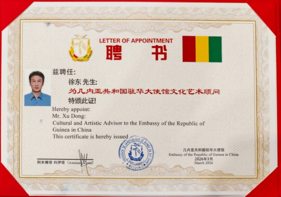 日前,著名书画家徐东(笔名鸿之)正式受聘为几内亚驻华大使馆文化艺术顾问。这一荣誉不仅是对其数十年艺术造诣与教育成就的权威认可,更意味着这位从北京走出的艺术家,将肩负起以丹青笔墨搭建中非文化桥梁的时代使命,为推动中非文明互鉴注入生动的艺术力量。