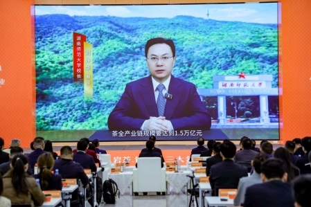 大会现场,各界嘉宾齐聚为茶产业科技创新建言献策。中国工程院院士刘仲华在视频致辞中指出,国家工信部等五部门明确 2030 年茶全产业链规模达 1.5 万亿元的目标,实现这一目标的核心在落地,“科技论文要写在茶园里,创新成果要用在企业中”。他高度肯定八马茶业的行业标杆作用,认为其是产学研用深度融合的典范,寄语八马茶业在绿色低碳、智能加工等核心技术上持续突破,打造世界一流茶企。