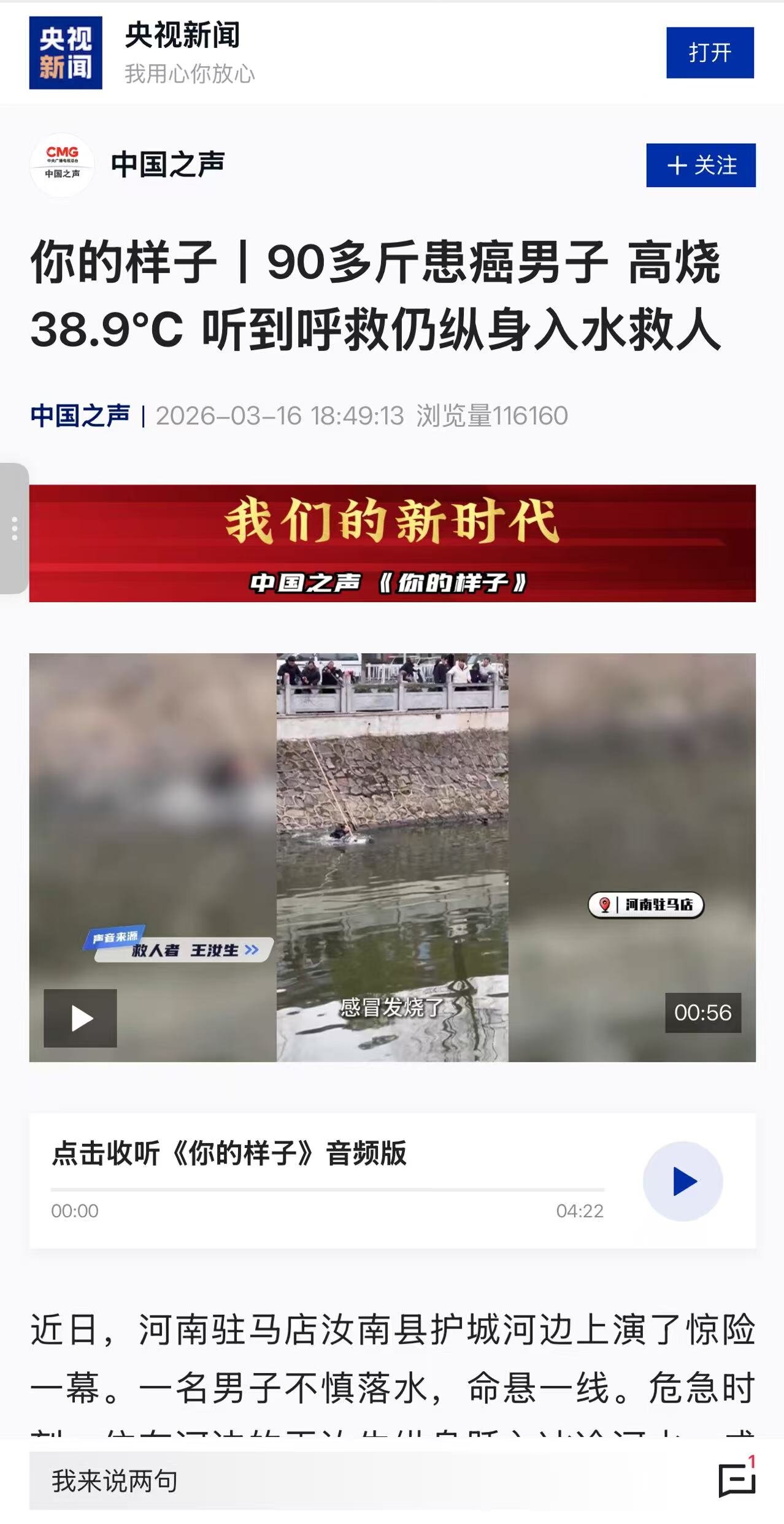中央广播电视总台央广中国之声《新闻进行时》3月16日报道“【你的样子】患癌 + 高烧38℃,听到呼救声,他仍毫不犹豫下河救人”:近日,河南 驻马店汝南县 护城河边 上演了惊险一幕。一名男子不慎落水,命悬一线。危急时刻,住在河边的王汝生纵身跃入冰冷河水,成功将落水者救起。而令人想不到的是,王汝生是一位体重只有90多斤、接受过胃全切手术的胃癌患者,救人时自己还在高烧中,但面对别人的呼救,他却义无反顾,用病弱的身躯撑住了一条鲜活生命的重量。