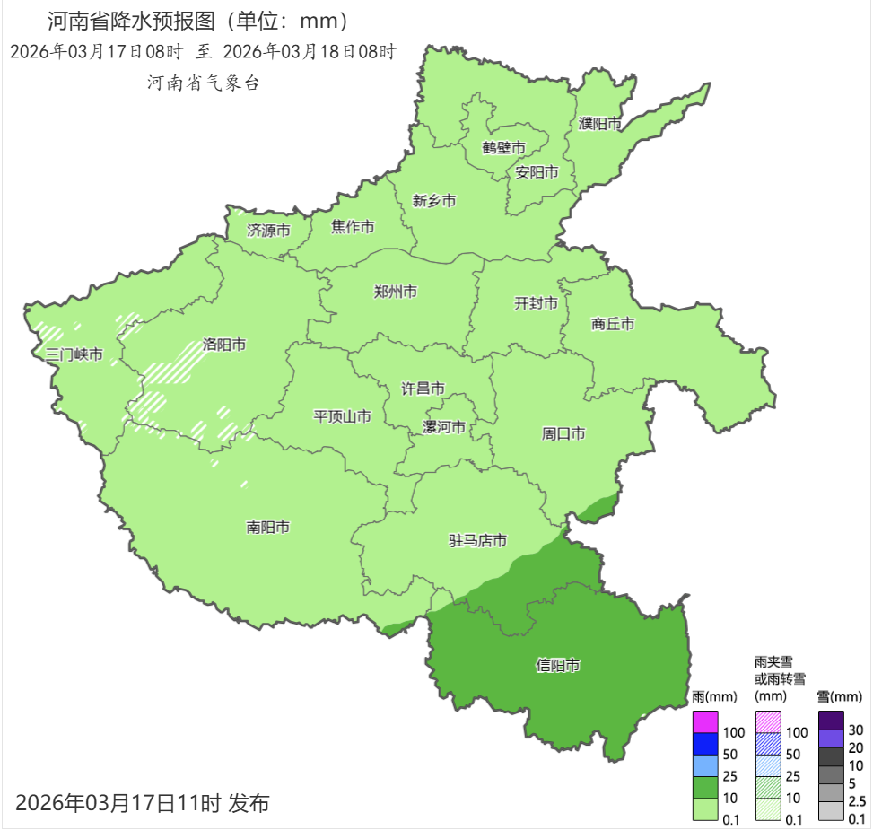 今天下午:全省有小雨,驻马店南部、信阳有中雨,西部、西北部高海拔山区有雨夹雪。
