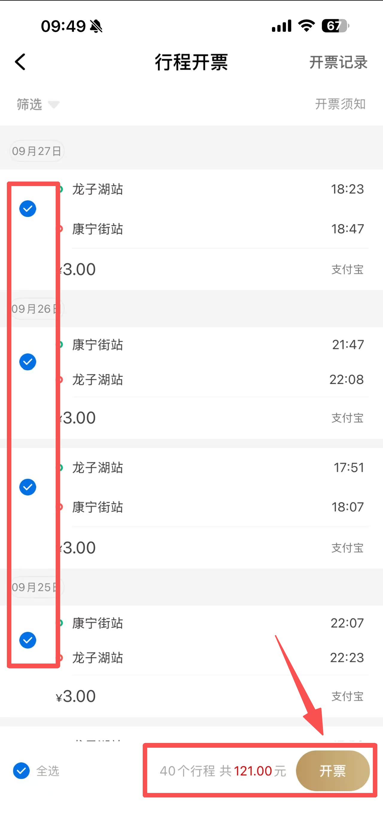 持单程票(线下买票)乘车的乘客,请您在目的站出闸前在车站配置的自助票务处理机(STM)自助申请开具电子发票