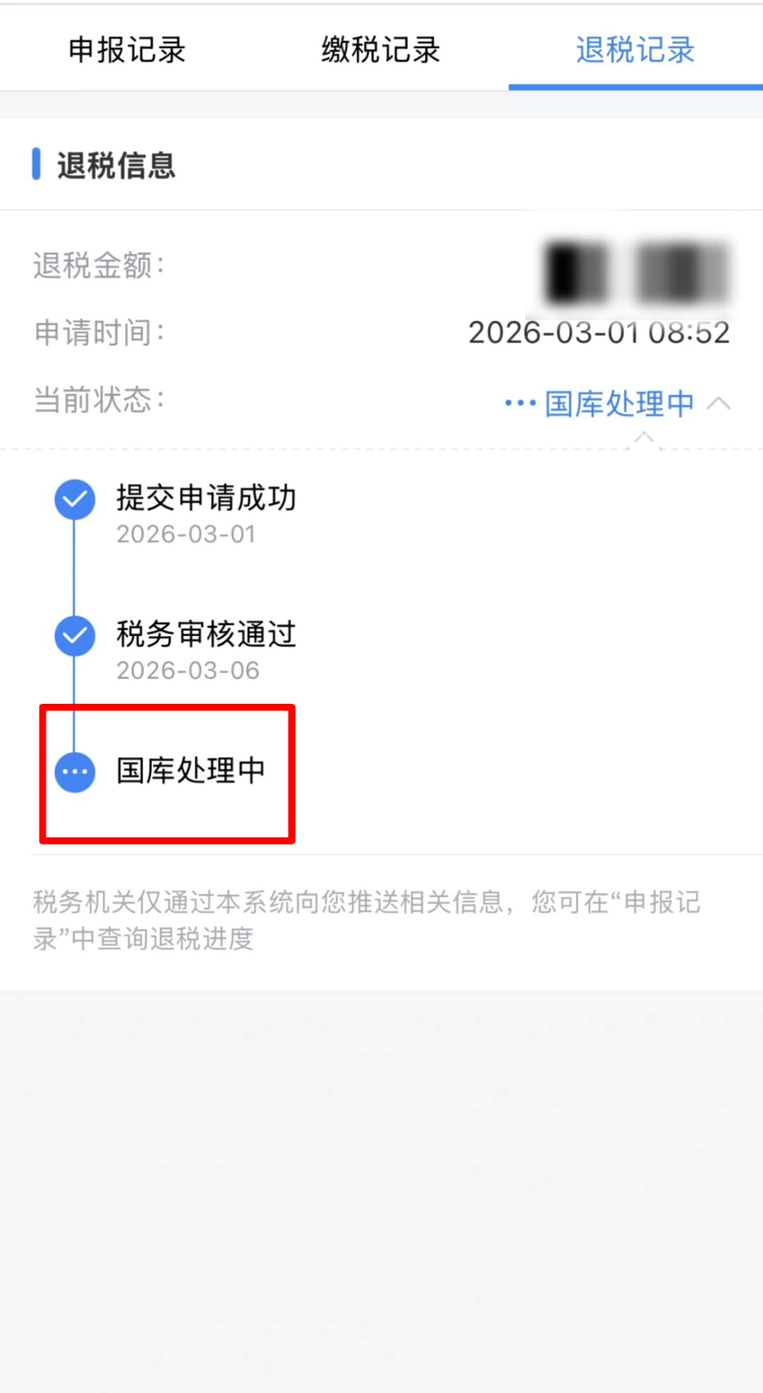 “国库处理中”表示税务机关已审核通过,并将您的退税申请提交国库,国库正在按规定处理中,请耐心等待。处理完成后,税款将由国库退至您填写的银行账户。