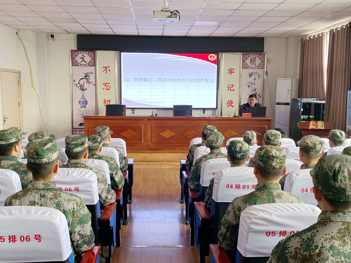 活动现场,气氛热烈而庄重,身着迷彩服的新兵们精神抖擞、端坐聆听,眼神里满是对军旅生活的憧憬与期待。重大刑事犯罪检察组负责人王峰结合春季征兵特点,采用“法条解读+真实案例”的方式,用接地气、通俗易懂的语言,围绕《中华人民共和国兵役法》《中华人民共和国刑法》《中华人民共和国军人地位和权益保障法》等核心法律法规,聚焦新兵们最关心、最贴近军营生活的法律问题展开讲解。