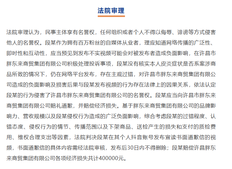 在段某发布视频后,许昌市胖东来商贸集团有限公司,安排旗下公司将案涉品牌内裤送检,三家质检机构先后出具质检报告,均认定案涉品牌内裤致敏性染料、耐水色牢度符合标准。案涉产品生产厂家提供的质检报告也显示,该品牌内裤耐水色牢度合格、可分解致癌芳香胺染料未检出。许昌市胖东来商贸集团有限公司以段某侵犯其名誉权为由诉至法院。法院审理认为,段某作为拥有百万粉丝的自媒体从业者,理应知道网络传播的广泛性、即时性和互动性,应当预见到发布不实视频可能会对被发布者造成负面影响,在许昌市胖东来商贸集团有限公司积极处理投诉事项,段某没有核实本人皮炎症状是否系案涉商品所致的情况下,仍在网络平台发布,存在主观过错,对许昌市胖东来商贸集团有限公司造成的负面影响及损害后果,与段某发布视频的行为存在法律上的因果关系,依法认定段某的行为侵害了许昌市胖东来商贸集团有限公司的名誉权。
