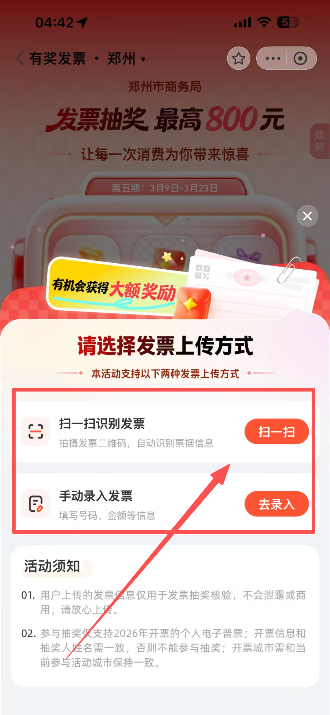 2️⃣点击【传发票去抽奖】,可选择【扫一扫识别发票】或者【手动录入发票】两种方式(建议扫一扫上传,直接可从相册导入发票,开具好发票后记得提前截图或保存)