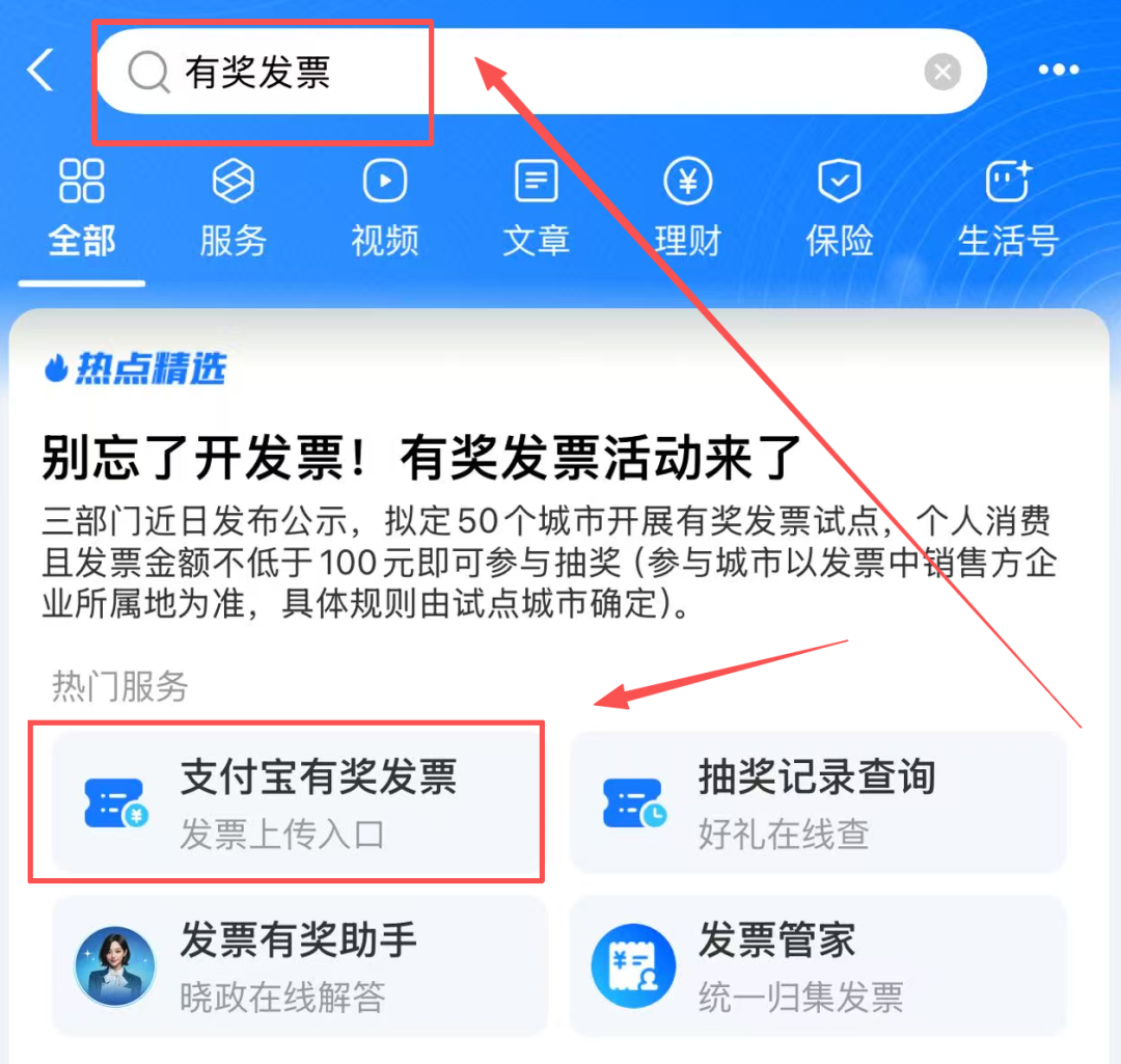 1️⃣打开支付宝App,搜索【有奖发票】,点击【支付宝有奖发票-发票上传入口】进入