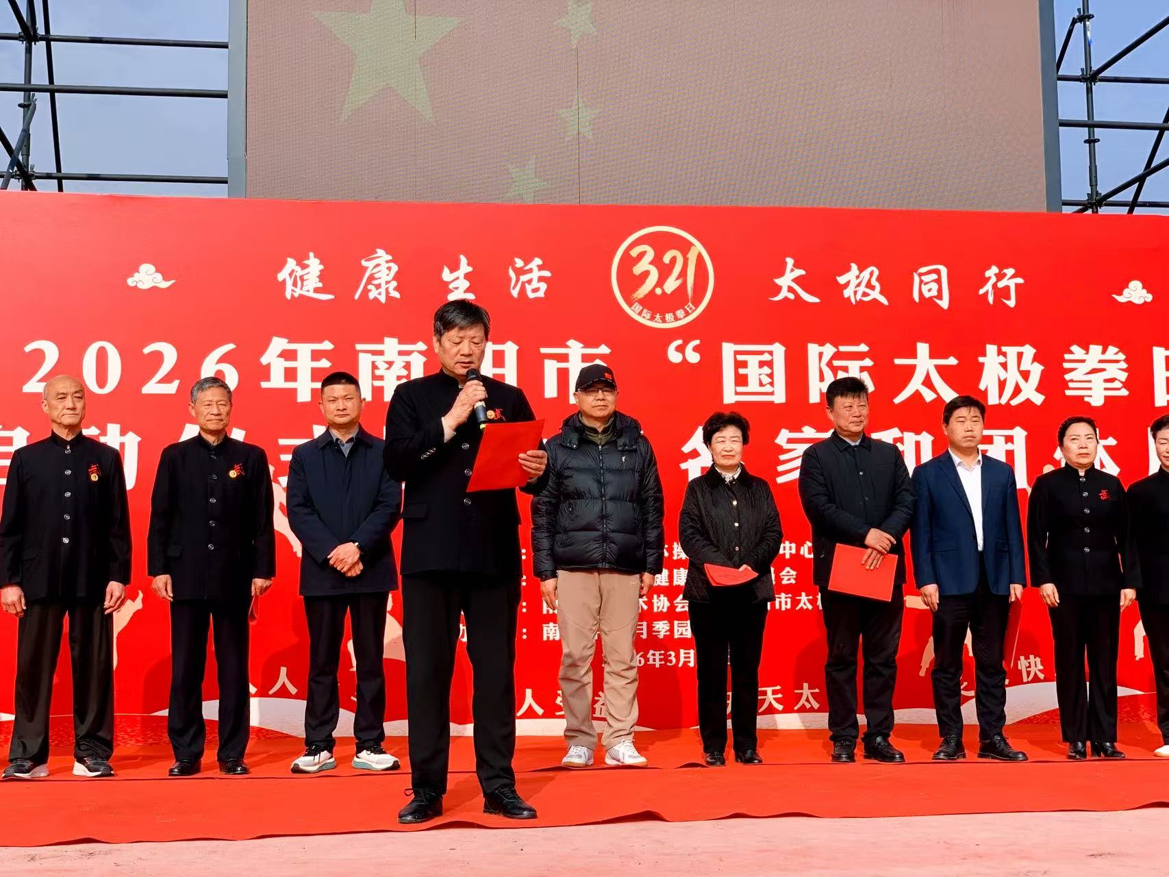 南阳祥龙投资公司副总经理马庆轩在欢迎辞对本次活动在中国月季园举办表示热烈的祝贺,对各位嘉宾和太极拳名家、太极拳团体的演出表示诚挚的欢迎和衷心地感谢。随即,武合建向全市人民和太极拳爱好者发出倡议,倡导大家“树立太极拳健身新理念、养成太极拳健身好习惯、掌握习学锻炼好方法”。随后,吴建波讲话。他强调:“太极拳作为中华民族优秀的文化瑰宝,以中国传统儒道哲学中的太极阴阳辩证理念为核心,集颐养性情、强身健体、技击对抗多功能于一身,结合易学五行变化和中医经络学、古代导引术、吐纳术而形成的‘内外兼修、柔和舒展、轻灵缓慢、刚柔相济’的特质,也成为中国文化符号而承载“一带一路”巨型航船,漂洋过海铸就成为世界“非物质文明”的标志。目前,全世界有180个国家和地区近四亿人在习练太极拳就是最好的佐证。”吴建波讲话结束后,市政协副主席华道梅宣布:“2026年南阳市首个‘国际太极拳日’系列活动启动!”