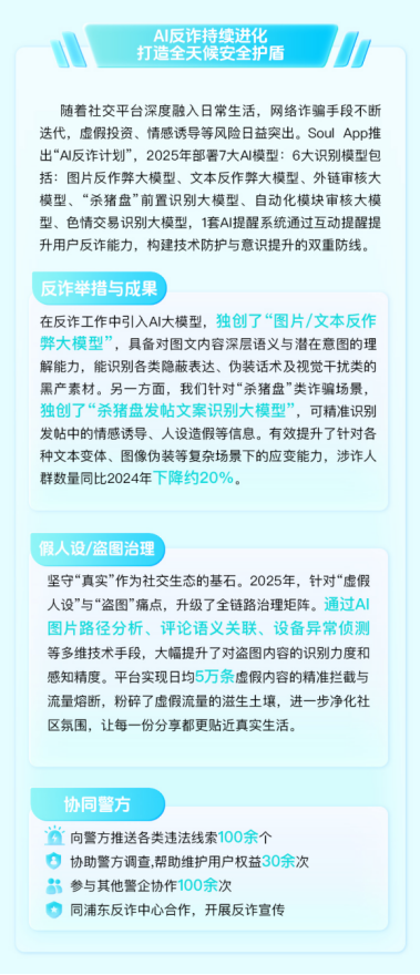 Soul深知安全治理并非孤军奋战,2025年持续深化与浦东反诈中心等部门的合作,构建起联防联治网络。平台全年向警方推送违法线索100余个,协助调查维护用户权益30余次,参与各类警企协作100余次,通过“站内拦截+站外打击”的闭环,让网络违法者无处遁形。同时,平台突破传统网暴治理模式,以AI情感分析模型实时监测攻击性语言,结合上下文判断情绪意图,日均提醒文明发言超20万次,更通过专题活动与科普宣传,让93.4万名用户签署友善互动声明,让社交礼仪内化于心。