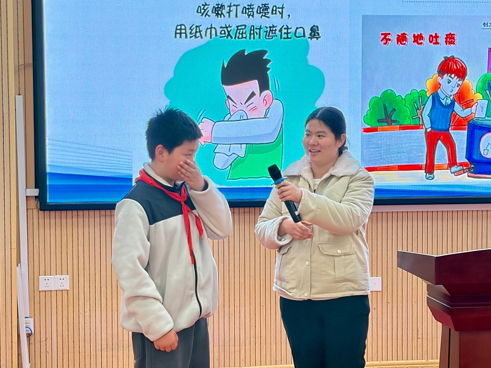 在防控知识讲解环节,卢医生与同学们积极互动,围绕结核病预防措施,介绍了卡介苗接种、佩戴口罩、勤洗手、保持清洁通风、增强体质等五项核心防控手段,并现场示范咳嗽礼仪,帮助同学们掌握基本防护技能,将防控知识内化于心、外化于行。