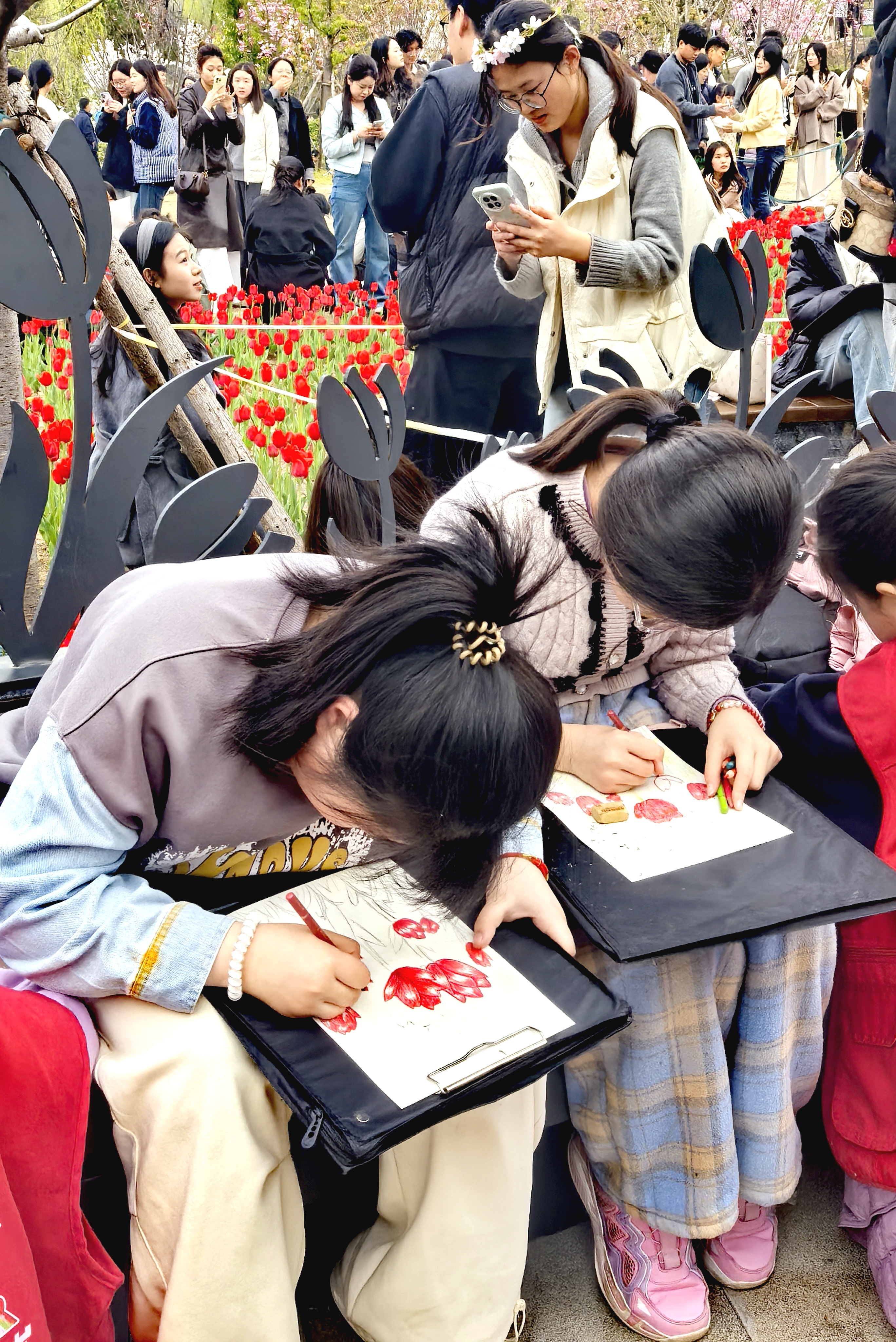 青年湖区域“水上花境”:利用人工生态浮岛,将缤纷郁金香栽植于青年湖水面,搭配各色草花,点缀信封与装满信笺的花筐。花影倒映碧波,色彩层次丰富,呈现一场独特的春日视觉盛宴。