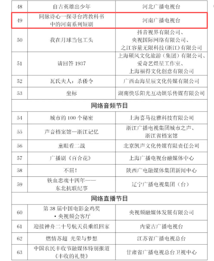 据悉,本次推选活动由国家广播电视总局组织开展,经省级广电行政部门和中央直属单位等推荐,专家评审委员会评审等程序,层层筛选,最终确定99部入选作品。入选作品《“同脉诗心——探寻台湾教科书中的河南”》,是以台湾教科书中出现的与河南有关联的古诗词为创作根基,深挖两岸历史文化中的渊源和联结,用竖屏短剧为形式,让沉淀千年的文字跨越海峡、穿越时空,带领观众循着诗词脉络,探寻背后蕴藏的家国情怀,实现两岸情感与共识的“双向奔赴”。