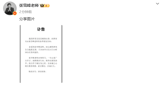 3月24日晚,张雪峰个人微博账号发布讣告。