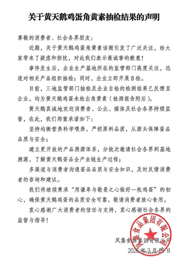 3月25日,凤集食品集团有限公司公众号发布,关于黄天鹅鸡蛋角黄素抽检结果的声明:近期,关于黄天鹅鸡蛋角黄素话题引发了广泛关注,给大家带来了疑虑和担忧,对此我们表示最诚挚的歉意。事件发生后,企业生产基地所在的监管部门高度关注,迅速对相关产品组织抽检;同时,企业立即开展自检。