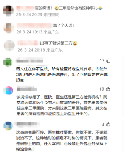 对此,网友的质疑直击要害:既然检测不重要,为何要让患者花五千多元的冤枉钱?医院既然推荐外送检测,就该对合作人员资质、报告真实性负审核责任。更让人不解的是,深圳的医生能一眼看出报告漏洞,作为三甲医院的中大五院,难道连这样的专业素养都没有吗?