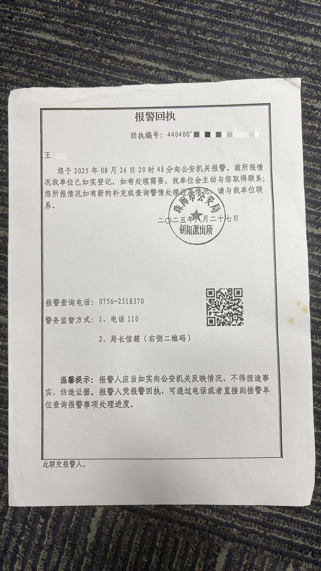 2025年8月,小王家属向珠海市香洲区朝阳派出所报案。