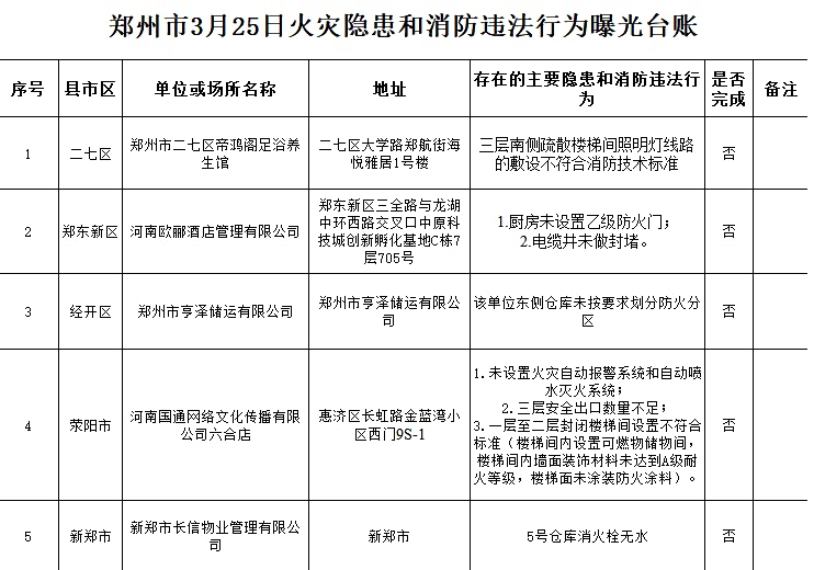 3月25日,郑州市消防救援支队对5家火灾隐患单位未按期整改的消防违法行为进行曝光,希望通过此次行动及时发现和整治一批消防安全隐患问题,进一步强化社会群众的消防安全意识,促进社会单位整改火灾隐患的自觉性。