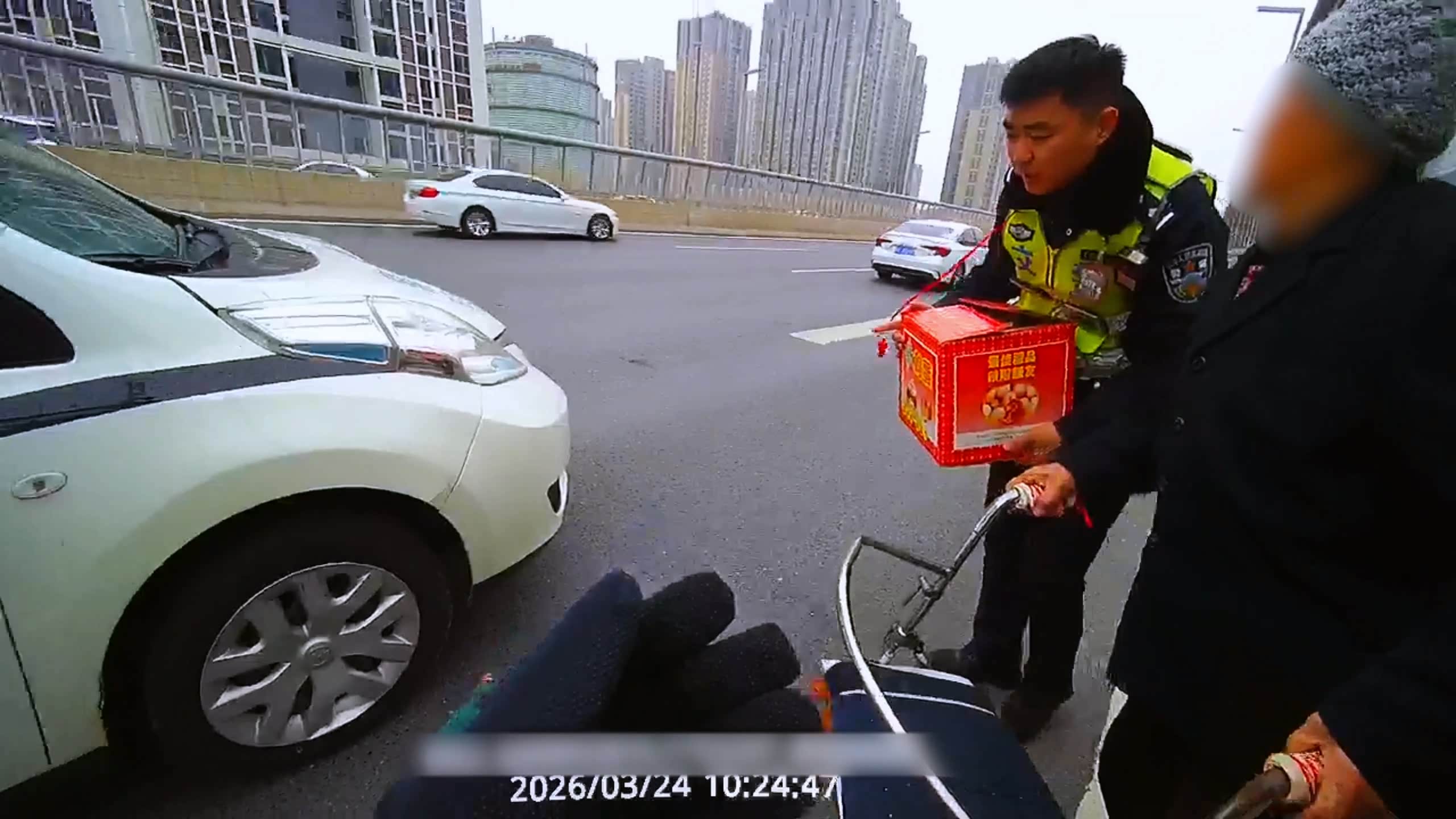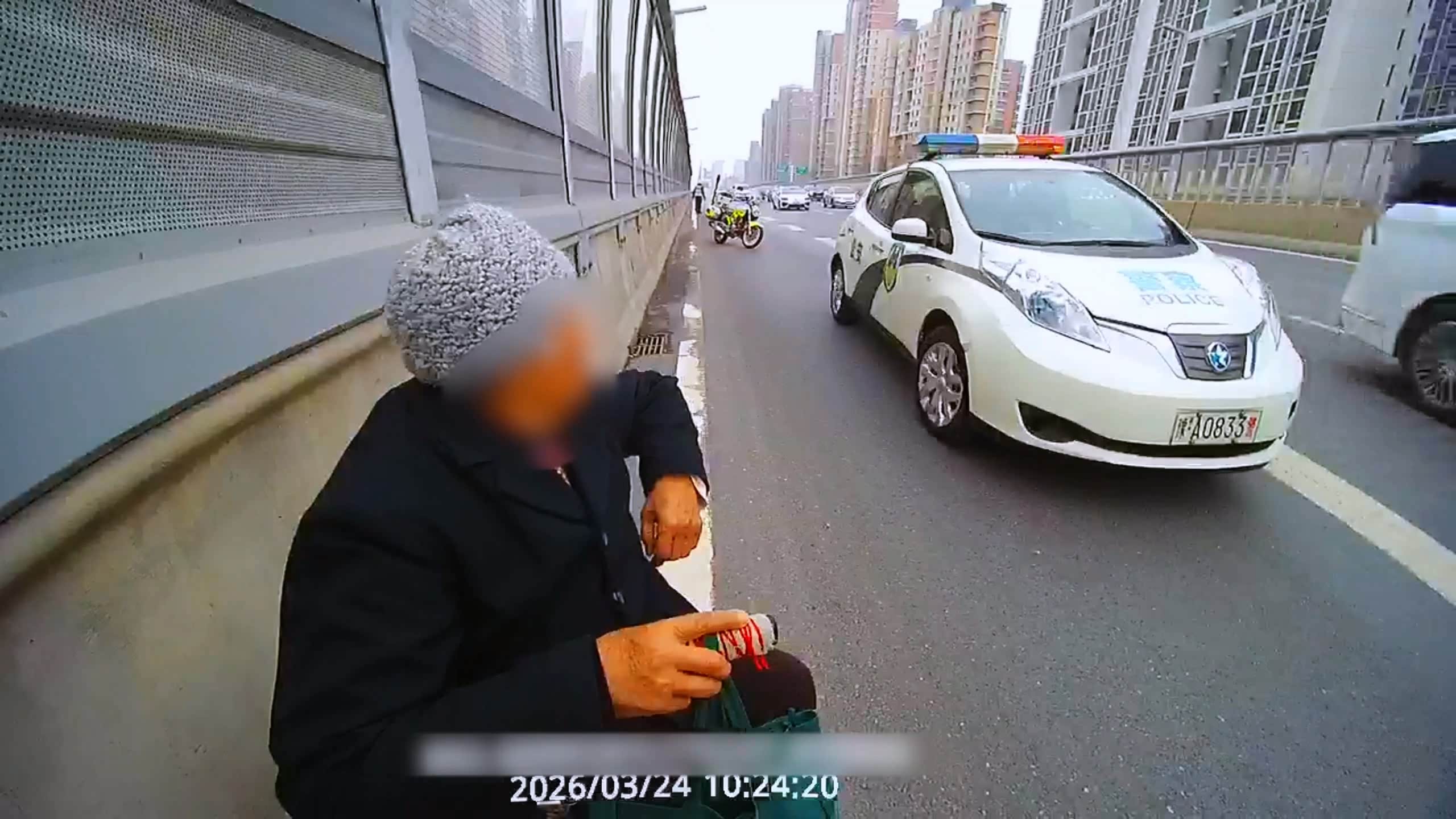 李威、郭蓬迅速将警用摩托车停在老人身后,警示后方来车,为老人筑起一道安全屏障。李威下车来到老人身边,耐心劝说她跟随交警下桥,同时呼叫同事驾驶警车前来接应。经了解,老人今年89岁,本打算徒步去北环找儿子,不知何时误入了高架桥。民警一边安抚老人情绪,一边设法联系其家属。