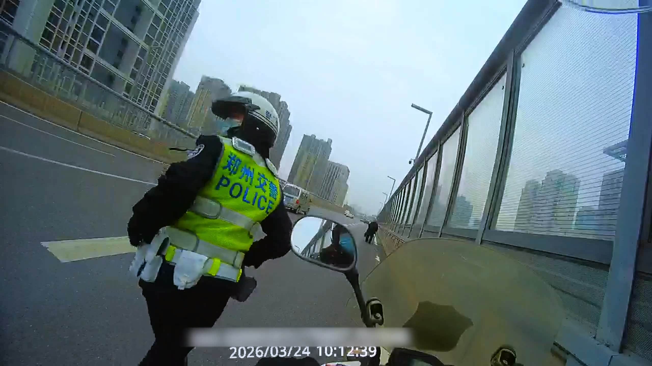 3月24日上午,郑州交警勤务二大队一中队民警李威、辅警郭蓬接到群众报警,称有一位老太太在郑州市陇海高架华山路桥的二层行走。接警后,李威、郭蓬立即驾驶摩托车赶往现场寻找。三分钟后,两人发现一位老人推着手推车,步履蹒跚地走在高架桥最右侧,身旁车辆呼啸而过,情况十分危险。