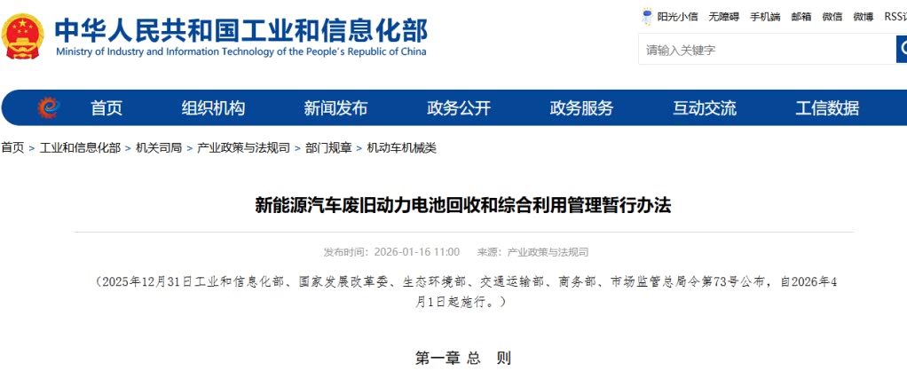工业和信息化部等6部门联合发布《新能源汽车废旧动力电池回收和综合利用管理暂行办法》