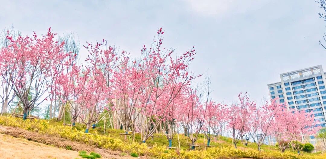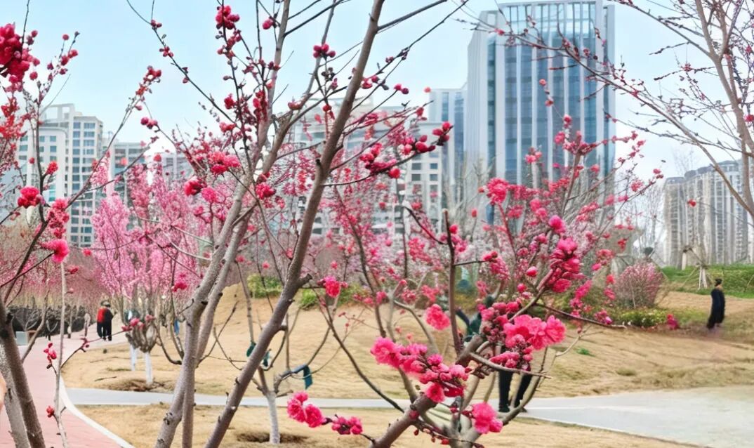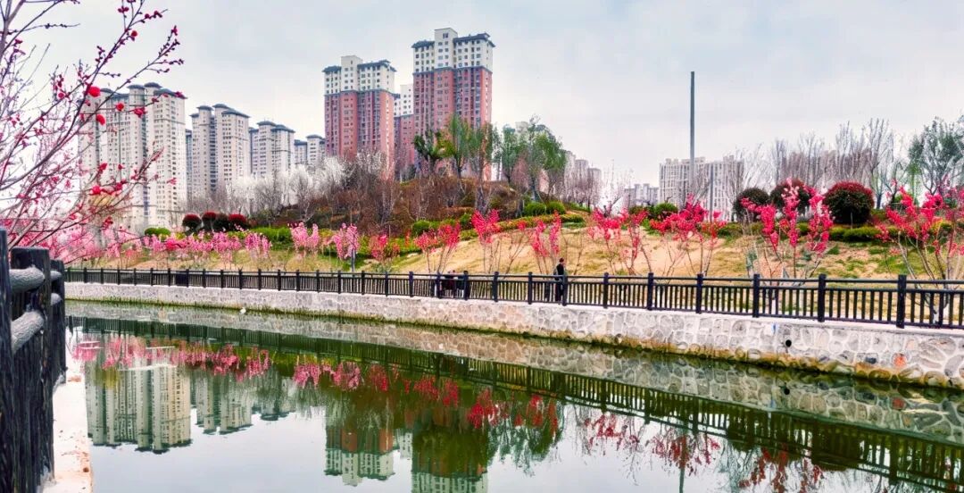 沿水系蜿蜒而行,桃源、桃溪、桃韵三座公园依次铺开,桃花山、桃花溪、桃花岛、桃花林等17处景观节点错落分布,真正是一步一景、步移景异。8000余株桃树临水而立,涵盖直枝、垂枝、寿星桃、帚型桃等80余个品种,从山碧桃、赤花蟠桃到宫粉桃、斑叶桃、芳菲桃,花色纷呈,姿态各异。更兼紫薇、雪松、金枝槐、大叶女贞、银杏、桂花、红叶石楠等百余种观赏植物相伴,四季轮转,景致不绝——春日赏花,夏来乘凉,秋可观叶,冬亦有景。今年1月,北万金渠活水引入,3月桃花如约盛放,“十里桃花堤”的壮美画卷从愿景照进现实,成就“一渠清水向东流、万枝桃花映画中”的诗意景象。