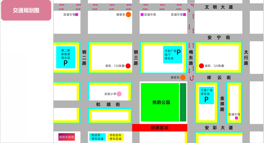 停车问题也为大家考虑周全。活动设主停车区和分流停车区两大区域:主停车区位于桃韵公园周边,涵盖祥云街(梅东路至钢三路段)、钢三路(祥云街至安彩大道段),以及安宁街与梅东路交叉口西南角万和地下停车场、梅东路与祥云街交叉口东南角香洲名郡地上停车场,非机动车停放人行道,机动车沿慢车道和快车道最外侧车道有序停放。主停车区压力较大时,将启用分流停车区,包括安宁街(钢三路至太行路段)、钢二路(安宁街至安彩大道段)等路段(安彩大道部分路段因学校原因不引导停车)。现场安排专人引导,设置清晰指示牌与导流标识,实行柔性执法、动态管控,车位余量实时监测,通过现场广播及时播报,引导车辆有序分流。此外,活动还联动“龙安万达”大型商业综合体和龙安公园景点,开通临时接驳车,让游客轻松往返、安心赏玩。
