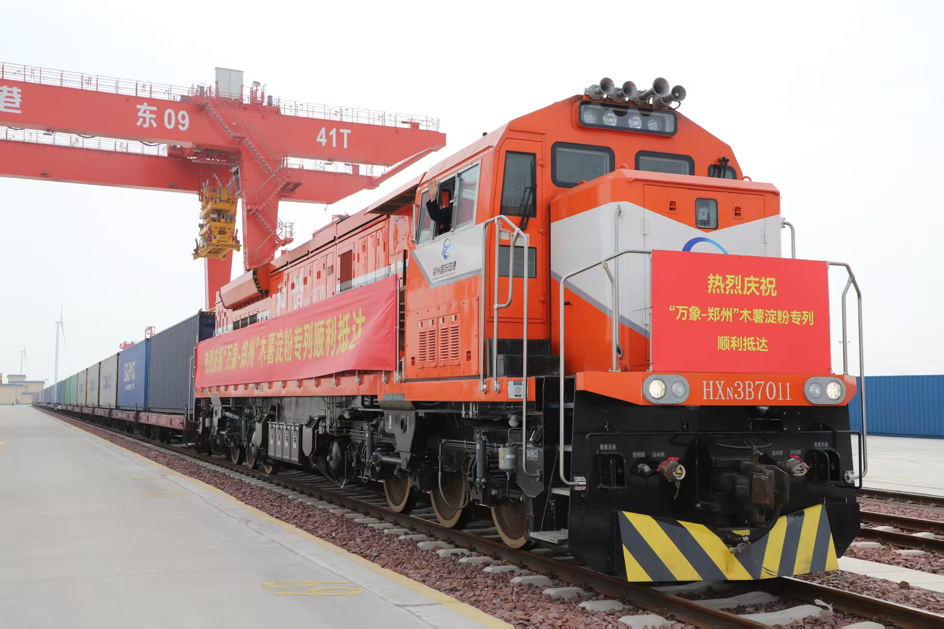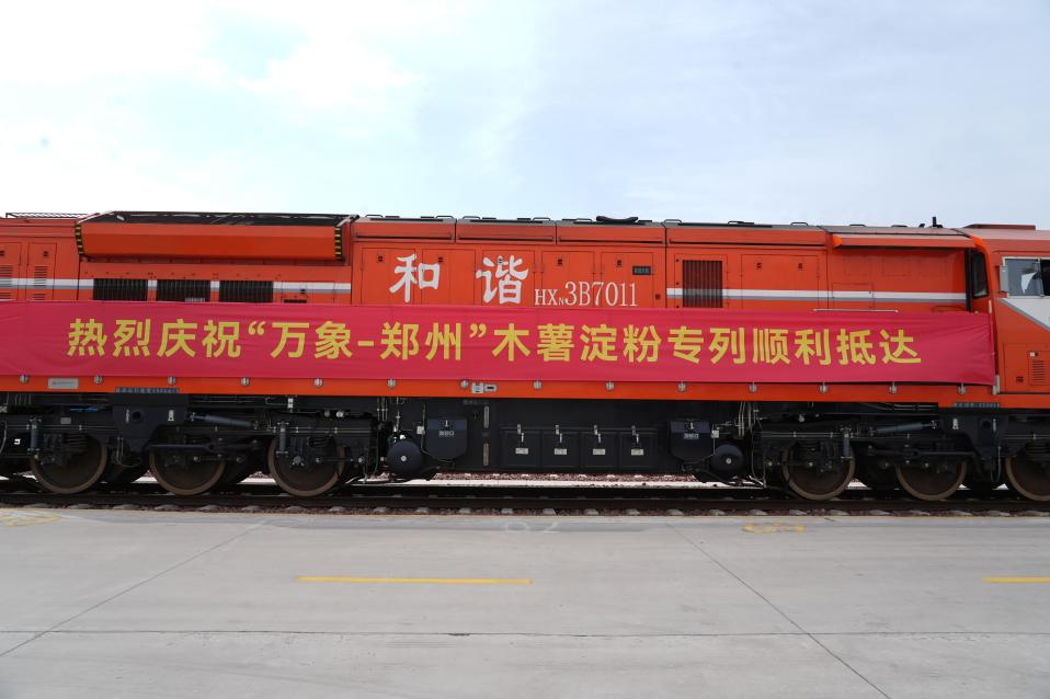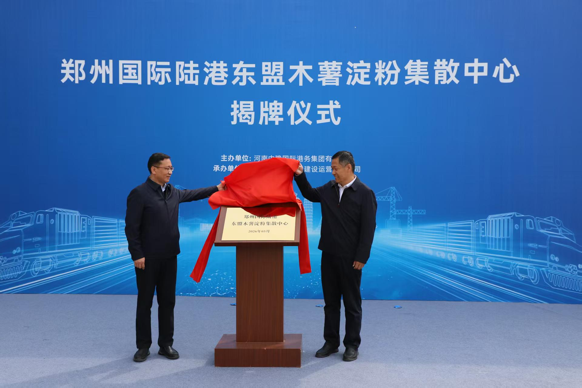 3月28日10时,来自东盟的木薯淀粉班列驶入郑州国际陆港东作业区站台,该趟国际班列合计35组,货重约950吨,从老挝万象站发出,经磨憨入境历时5天到达郑州。现场彩旗飘扬、气氛热烈,郑州东盟木薯淀粉集散中心正式揭牌成立.