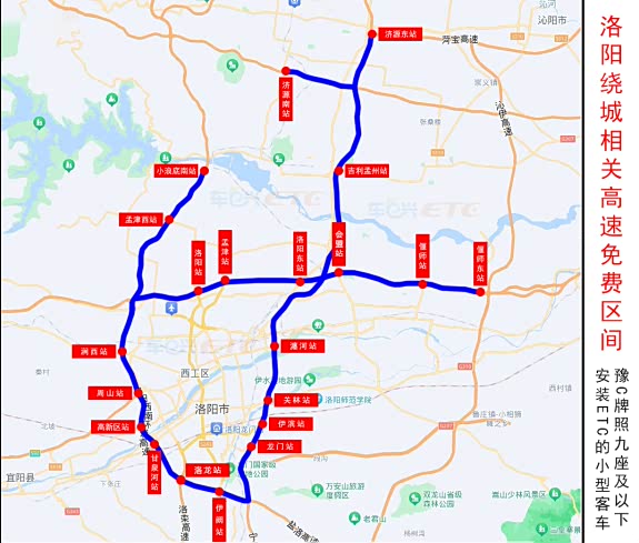 洛阳站、孟津站、洛阳东站、瀍河站、关林站、伊滨站、龙门站、伊阙站、洛龙站、甘泉河站、高新区站、周山站、涧西站、吉利孟州(孟州吉利)站、会盟站、偃师站、孟津西站、济源东站、济源南站、小浪底南站、偃师东站共21个收费站。