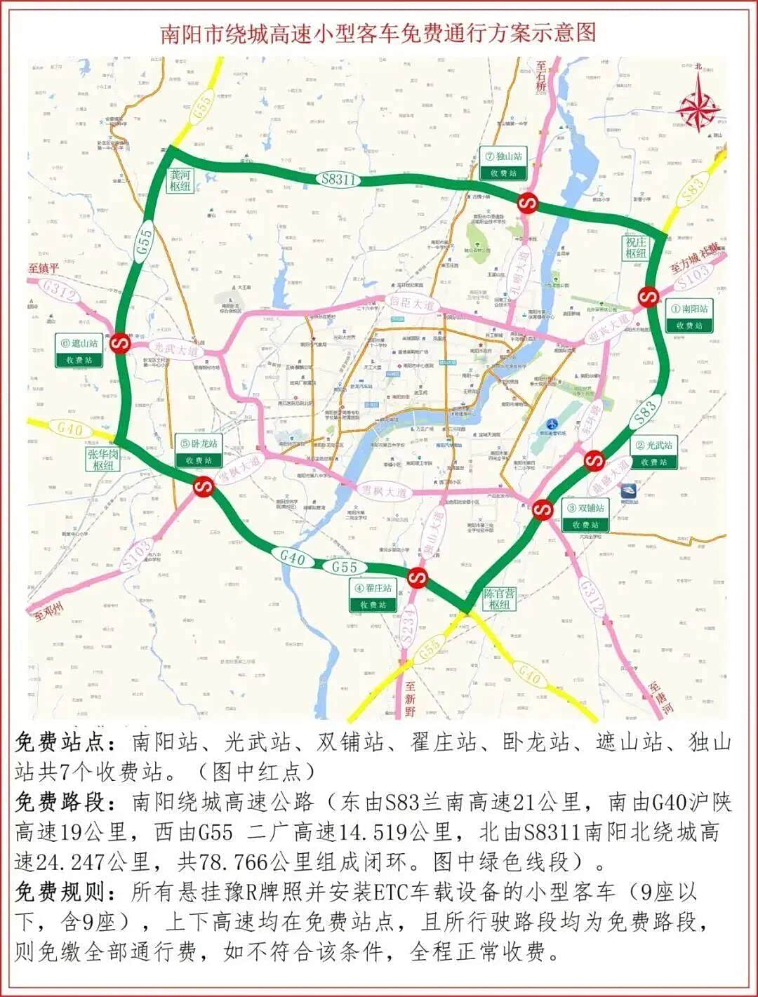 南阳站、光武站、双铺站、翟庄站、卧龙站、遮山站、独山站共7个收费站。
