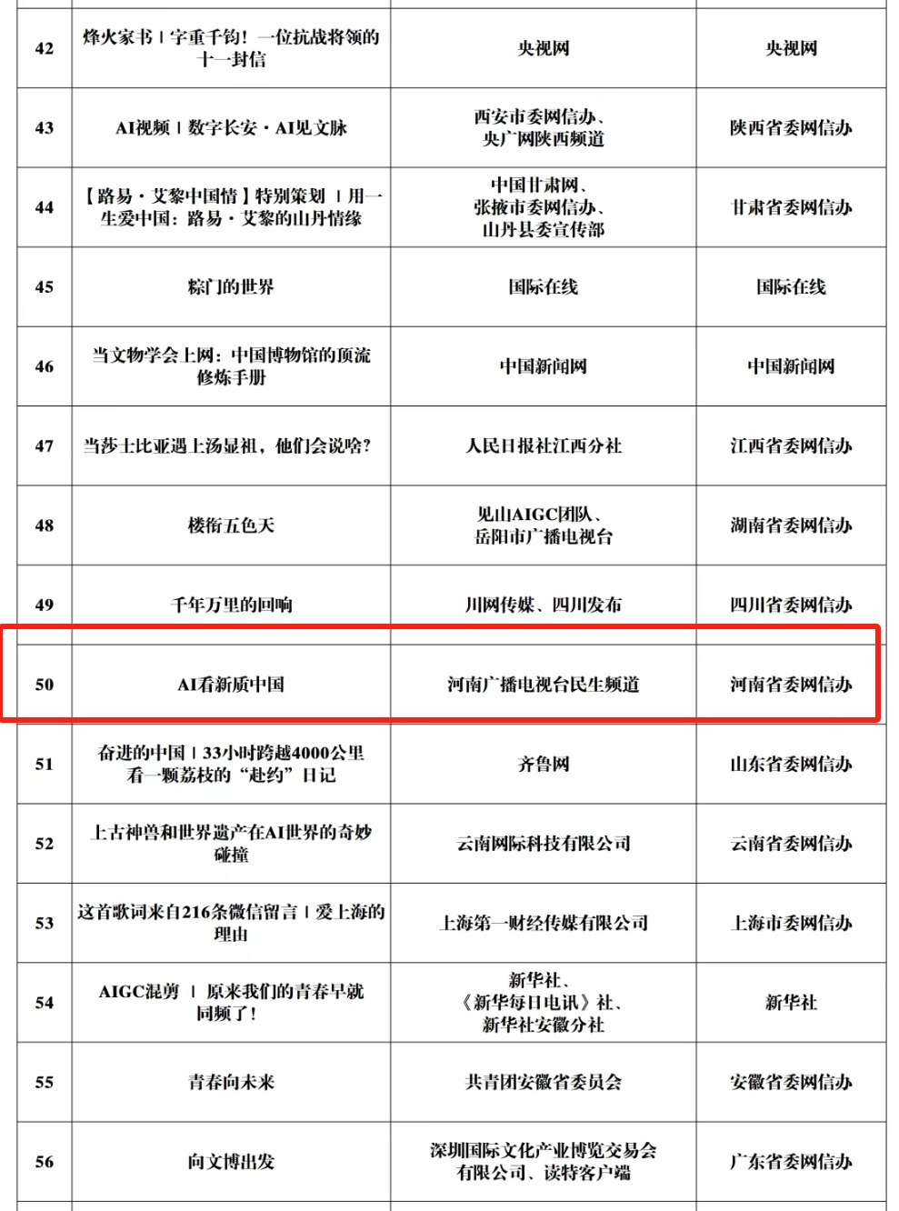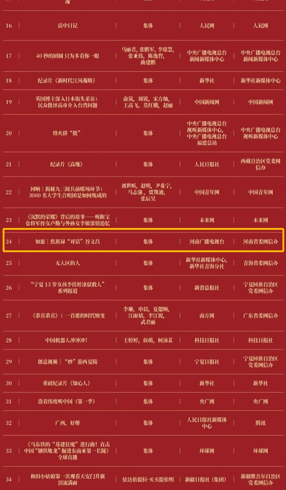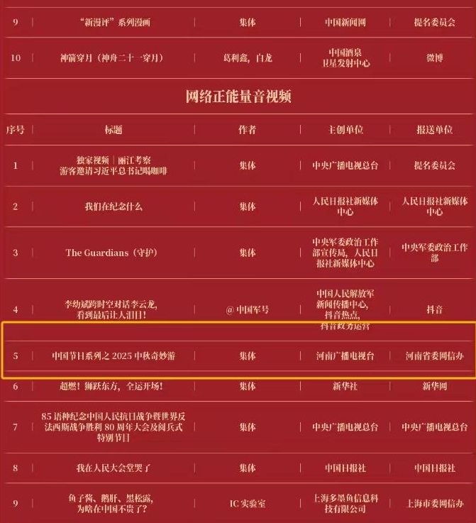 由中央网信办主办的2025中国正能量网络精品征集展播活动3月29日揭晓,经过大众评审、专家评议、评委线上打分和线下评审以及结果公示,50件十佳网络精品及500件网络精品脱颖而出。其中,河南台2部作品获选,包括《中国节日系列之2025中秋奇妙游》《如愿|焦裕禄“对话”谷文昌》。另外,在3月28日揭晓的2025中国正能量网络传播AI精品案例评选中,河南台作品《AI看新质中国》榜上有名。