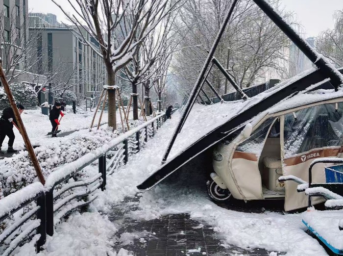 2日凌晨,龙庆街道北杨庄社区党支部委员、灾害风险隐患信息报送员窦志磊巡查时发现,小区北车棚因积雪已发生大面积坍塌,于是立即上报。接报后,街道应急办迅速响应、即刻赶赴现场开展应急处置工作,一方面组织人员快速开展积雪清理,对现场及周边开展全方位安全隐患排查,严防坍塌二次事故发生。同时,第一时间向小区业主群发布温馨提示,明确告知北车棚坍塌受损情况,重点提醒居民远离坍塌区域、注意出行安全。由于风险隐患发现处置及时,无人员伤亡。