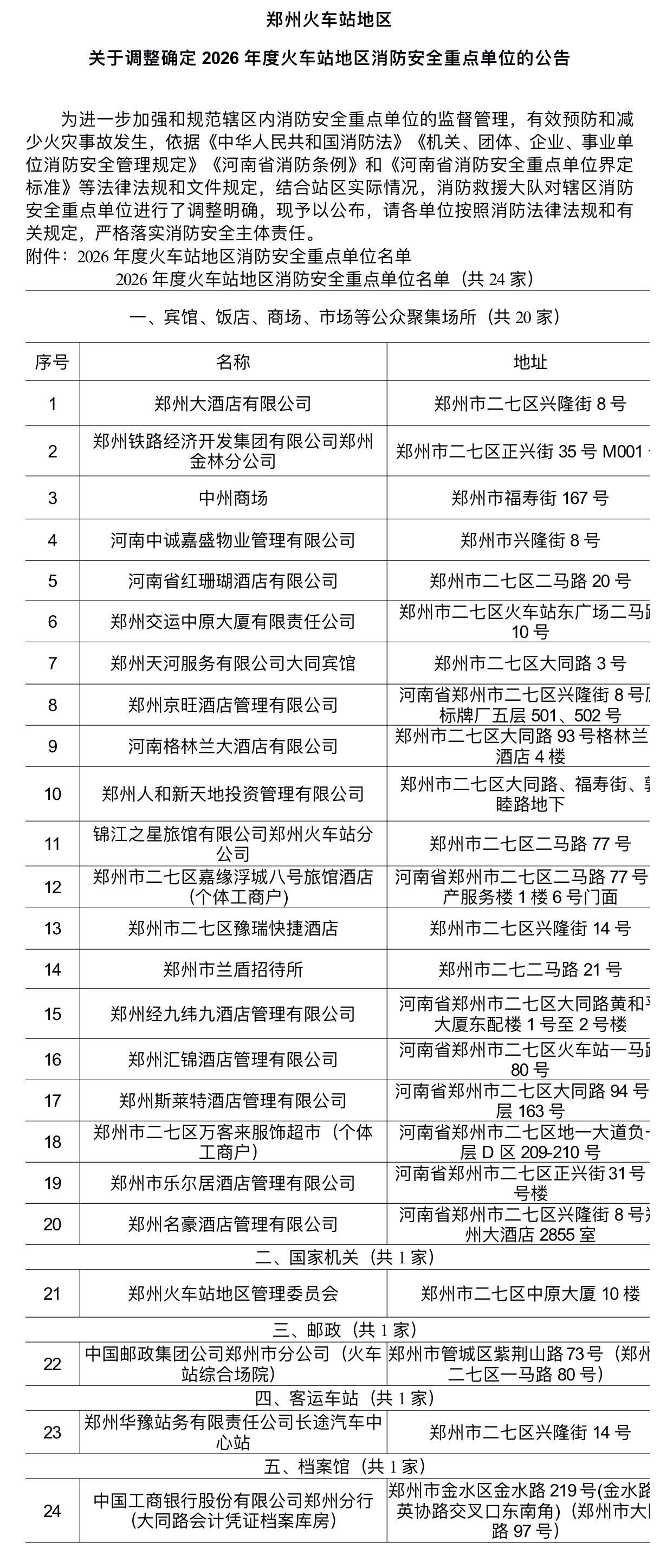 大象新闻记者了解到,依据相关消防法律法规及界定标准,结合站区实际,郑州火车站地区消防救援大队对辖区消防安全重点单位进行调整确定并公布,共 24 家单位。要求各相关单位严格落实消防安全主体责任,切实做好火灾防控工作。