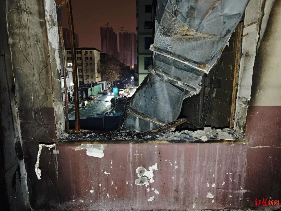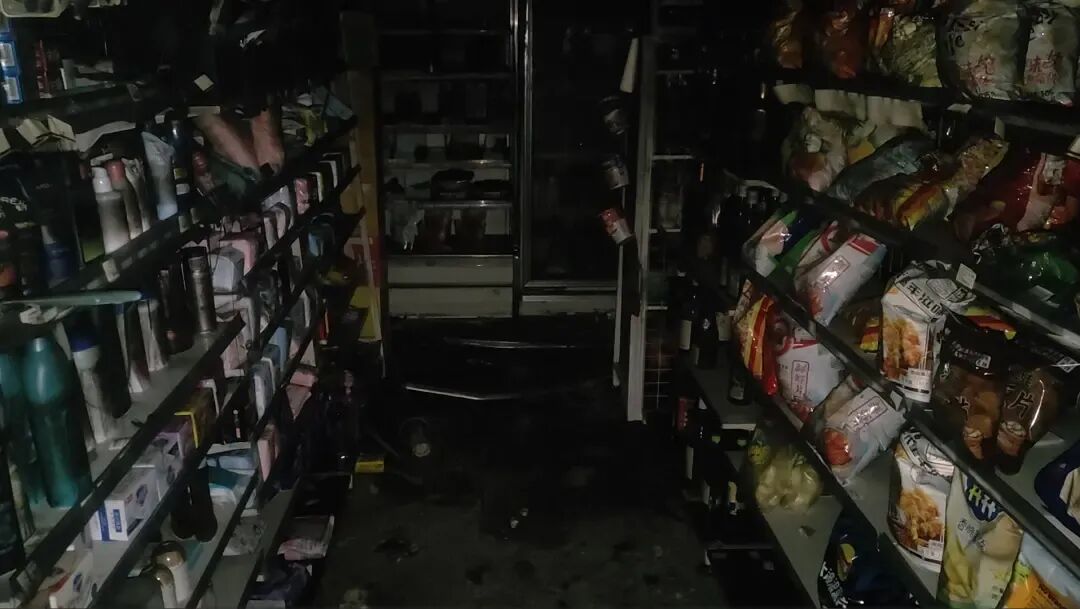 记者发现在事故中损毁最严重的是底商一家便利店和两家饭店——转角楼川菜馆和大龙烧烤炒菜店,不过从内部看,即使最严重的三家店铺都没有大面积过火,内部物件被浓烟熏黑。